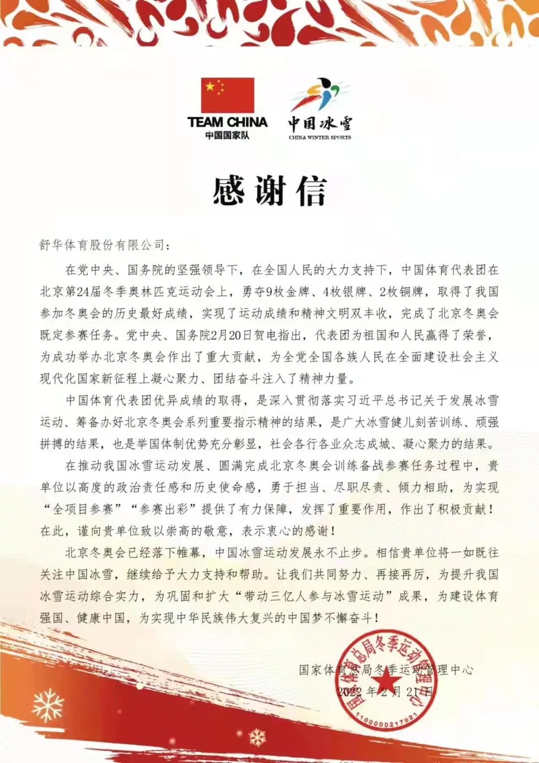 2022 国家体育总局冬季运动管理中心感谢信 国家体育总局冬季运动管理中心 感谢信 查看