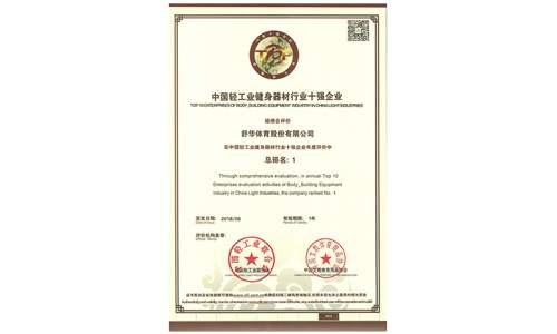 2018 中国轻工业健身器材行业十强企业 中国轻工业联合会/中国文教体育用品协会 荣誉证书 查看